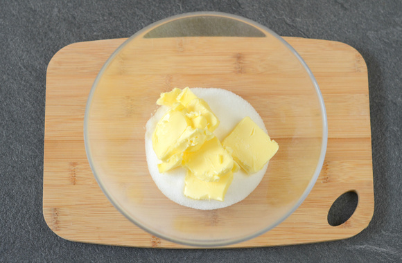 Dans un saladier, fouettez le beurre pommade avec le sucre.