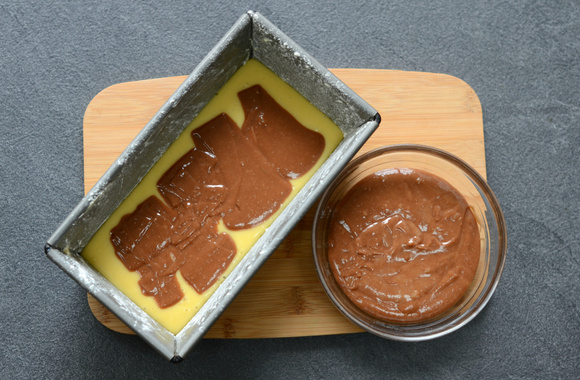 6Beurrez et farinez un moule à cake. Garnissez-le de la moitié de la pâte nature.