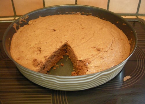 Beurrer un moule, verser la pâte et faire cuire le gâteau au four pendant 35 min à 160°C. Piquer le gâteau à l'aide d'un couteau et si il ressort sec, le gâteau est cuit !