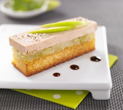 Poêler rapidement les tranches de Quatre-quarts côté épices. Puis, sur chaque finger de Quatre-quarts, disposer de la compotée de pomme verte et une tranche de foie gras.