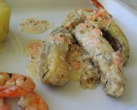 Dans les assiettes de service, déposer les morceaux de lotte et le saumon fumé, décorer de pluches d'aneth, servir avec des pommes vapeur ou un riz blanc.