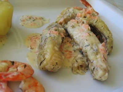 Ajouter la crème fraîche, avec les gambas décortiquées, le saumon fumé coupé en morceaux, et les moules. Salez, poivrez, et ajoutez quelques pluches d'aneth, et une pincée de curry. Laissez frémir, quelques minutes.