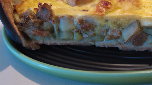 Étaler la pâte dans un moule beurré, y ranger les pommes et le boudin, puis verser le mélange.