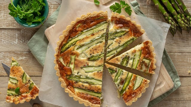Coupez le saumon et les asperges, une fois cuites, en morceaux et garnissez le fond de tarte avec.