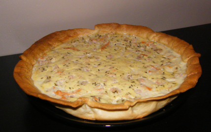 Fouetter les 2 oeufs avec la crème + sel + poivre + le saumon + les crevettes.