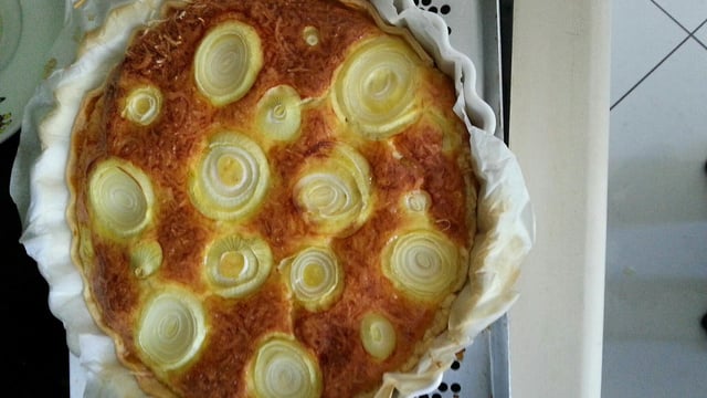 Placer le fond entre 5 et 10 minutes dans un four préalablement chauffé à 200° pour bien imperméabiliser le fond.Eplucher vos oignons et les couper en fines lamelles