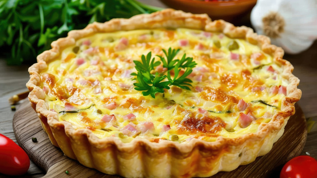 Badigeonner le fond de tarte de moutarde puis répartir dessus les dés de jambon et verser la préparation.
