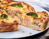 Disposez au fond de la tarte les tranches de saumon fumé coupées en petits carrés. Égouttez le brocoli et disposez-le sur le saumon.