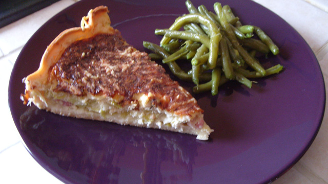 Dérouler la pâte dans un moule à tarte et y verser les lardons et les poireaux.
