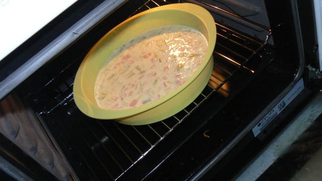 - 5Laissez cuire au four environ 30 minutes en surveillant régulièrement.Pour surveiller il vous suffit de planter la pointe d'un couteau dans votre quiche et de voir si il y a de la pâte qui reste quand vous le ressortez ou pas.