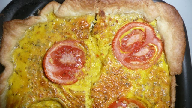 Mettre le tout sur les céréales et la pâte, sans mélanger. Laver la tomate, couper en tranches, et disposer sur la quiche.