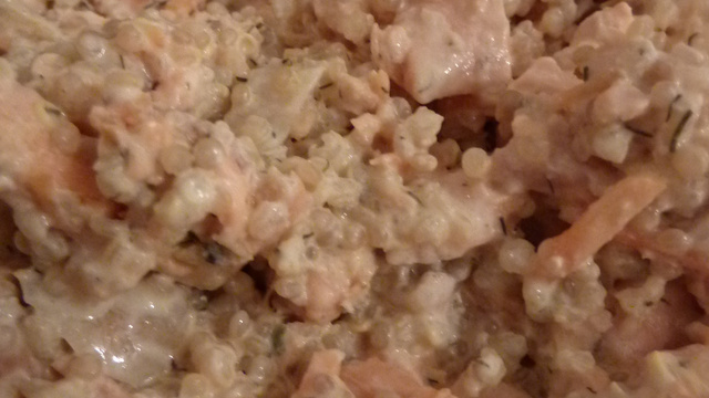 Laisser cuire 5 minutes puis ajouter le pavé de saumon et l'émietter au fur et à mesure de sa cuisson. Ajouter les épices puis le quinoa quand le saumon est bien cuit.
