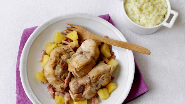 Ajoutez les lardons fumés, l'oignon ciselé, du sel et du poivre selon votre goût et remuez. Ajoutez le cidre et faites mijoter le tout à couvert environ 20 minutes à feu moyen. Retournez les demi-râbles de lapin à mi-cuisson.