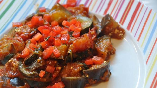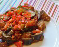 Laver et couper en rondelles les courgettes et les ajouter. Faire de même avec l'aubergine. Couvrir et cuire à feu doux jusqu'à ce que tout les légumes soient bien cuits. Si les courgettes ou aubergines manquent de cuisson et que la préparation n'est plus assez liquide, il faut rajouter de l'eau, puis continuer la cuisson.