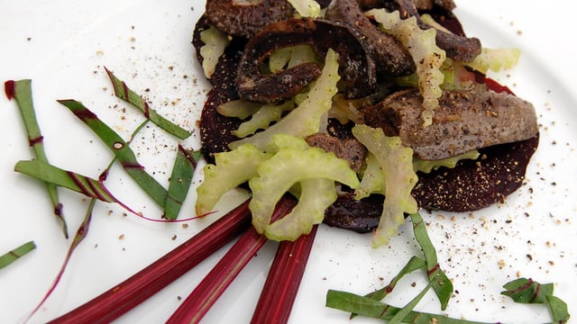 De la rate cuite préparée sur un carpaccio de betteraves et de céleri
