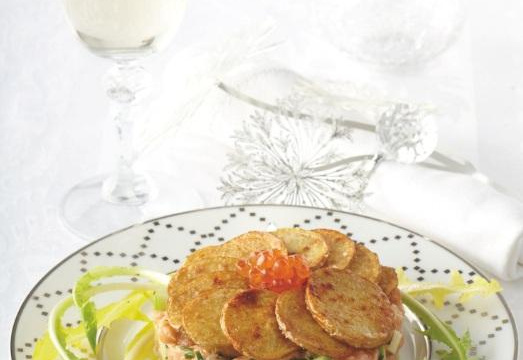 Réservez au chaud. Au moment de servir, dressez dans chaque assiette à l'aide d'un cercle le tartare de saumon.