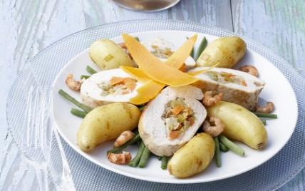 Répartissez dessus le mélange légumes-crevettes. Roulez l'ensemble de façon à former un boudin. Fermez-les bien aux extrémités. Piquez-les à la pointe d'un couteau afin que le bouillon puisse imprégner la chair du chapon.