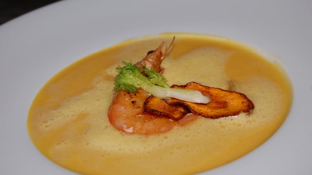 Verser le velouté, la mousse de légumes, poser la gambas, 2 chips de carotte et un brin de fenouil.