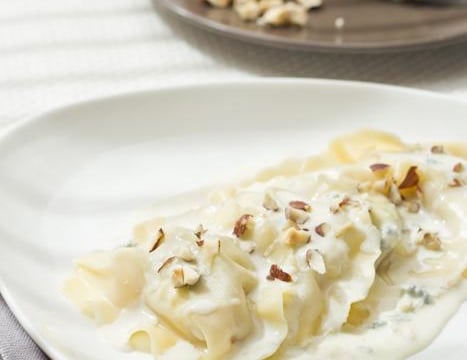 Faire cuire les ravioles pendant quelques minutes dans de l'eau bouillante additionnée d'un bouillon cube, le temps de cuisson dépend de l'épaisseur de la pâte, de 2 à 5 minutes. Égoutter les ravioles et les servir nappées de sauce et parsemées de noisettes concassées.