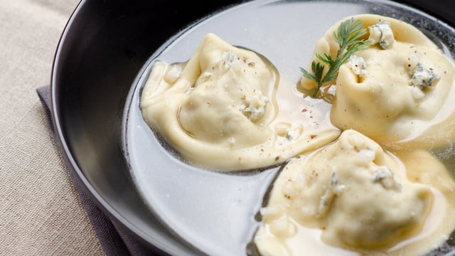 Des ravioles farcies de Roquefort, champignons des bois, volaille, poire, et noix, dans un bouillon de volaille clair.