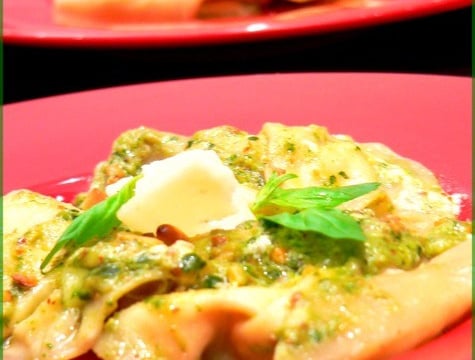 Ajoutez du pesto dans chaque assiette avec un peu de pignons de pins grillés et des copeaux de parmesan.