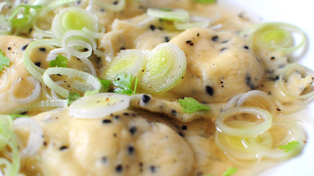 Crevettes, sésame noir et poireaux pour des ravioles pleines d'idées !