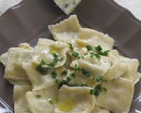 Préparer la pâte à raviole en mélangeant l'œuf, la farine, le sel et l'huile d'olive. Obtenir une pâte élastique et la filmer et la mettre au frais pendant 30 minutes minimum.