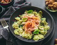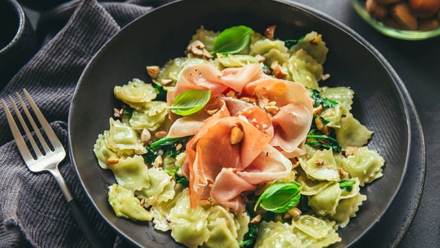 Un plat complet avec ses ravioles, son jambon et ses épinards. Un vrai délice.
