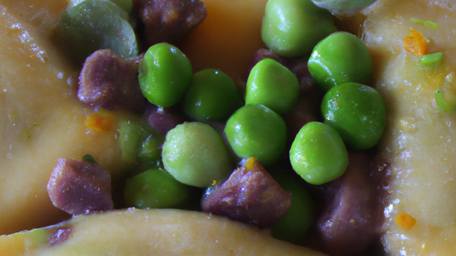 Ecosser et cuire 10 min les petits pois dans très peu d'eau avec le lard fumé détaillé en petits cubes. Puis y ajouter le miel et les épices en fin de cuisson. Réduire en purée.