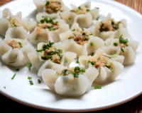 Avec la pâte, faites plusieurs petites boulettes de la taille d'une oeuf de caille. Etalez la boulette de pâte le plus finement possible en formant une galette ronde.Mettez une cuill. à café de farce au centre de la galette. Formez un raviolis sous forme d'étoile à 6 branches