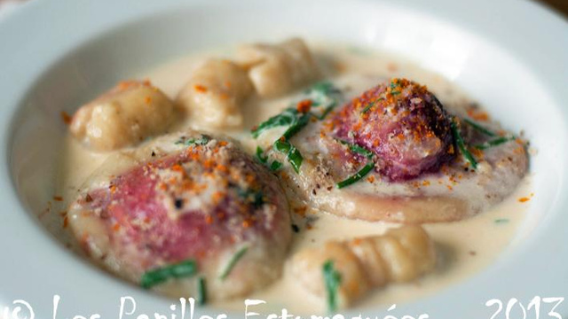 Des raviolis en pâtes de pommes de terre composés d'une farce à la betterave, au chèvre frais et au pesto de roquette. Le tout est servi avec une sauce à la crème et ciboulette et décoré de noisettes et de zeste d'orange.