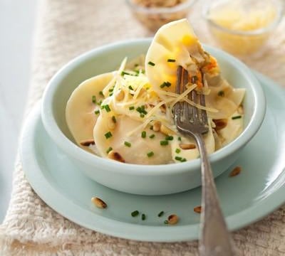 Plonger les raviolis dans une grande casserole d'eau frémissante pendant environ 45 secondes puis les égoutter. Disposer les raviolis encore chauds dans des assiettes creuses et les napper avec la crème de Gusto Intenso obtenue au début de la recette. Parsemer le restant de Gusto Intenso, les pignons de pin et la ciboulette fine sur l'assiette et servir immédiatement.