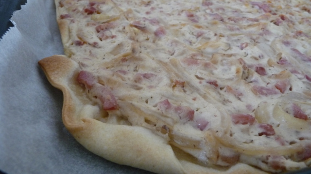 Depuis mon arrivée en Alsace , je me régale tant au niveau des spécialités que des restaurants ! J'ai donc décidé de créer sur mon blog une catégorie "Recettes d'Alsace" et je commence par vous présenter aujourd'hui la célèbre Flammekueche ou Tarte Flambée en version moitié classique et moitié gratinée au fromage râpé.