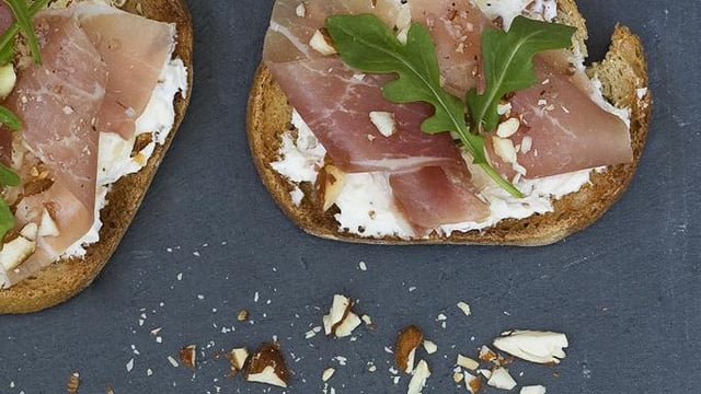 Étalez un peu de mélange de fromage frais sur chaque tartine. Déposer ensuite les lamelles de jambon et quelques feuilles de roquette. Déguster aussitôt.