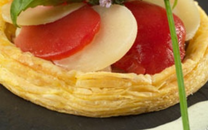 - Enfourner 15 min puis à la sortie du four alterner en rosace tomates et ossau