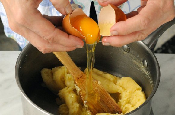 4Retirez la casserole du feu et ajoutez les oeufs un par un, en mélangeant à la spatule à chaque fois, jusqu'à ce que l'oeuf soit bien incorporé.
