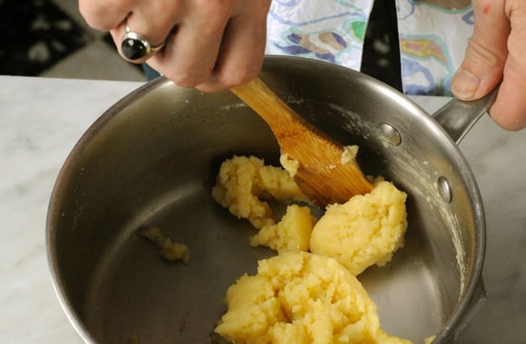 3Remettez la casserole sur feu doux et faites sécher la pâte pendant 2 ou 3 min en remuant sans arrêt.