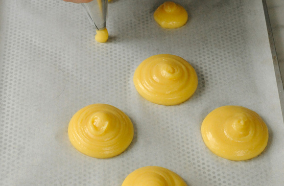 5Mettez la pâte dans une poche à douille et formez les choux en suivant les cercles tracés sur le papier sulfurisé.