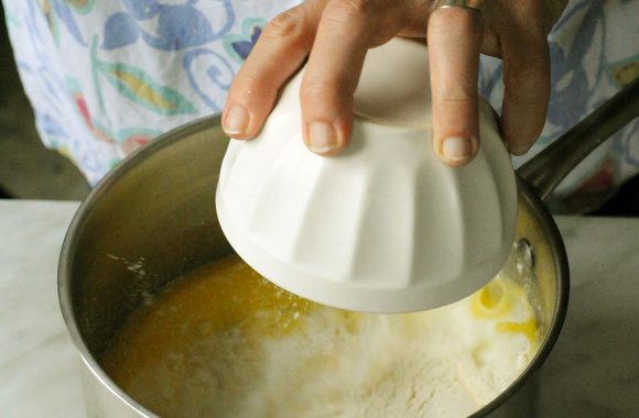 7Quand le lait est bouillant, versez-le en filet dans le saladier, tout en continuant de fouetter.
