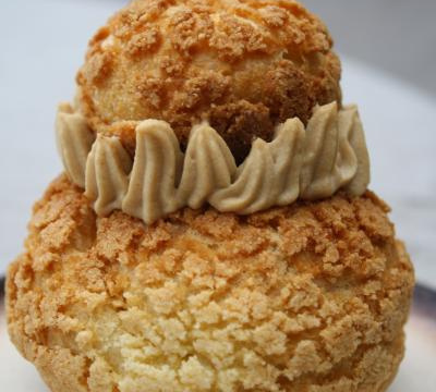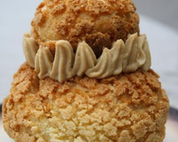 Une religieuse fourrée à la crème pralinée et recouverte d'un biscuit croustillant.