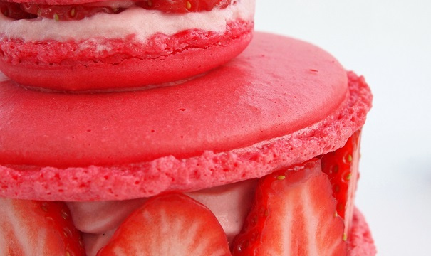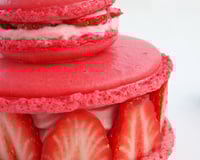Procédez au montage. Garnissez les coques de macaron à l'aide de fraises fraiches et de la crème à la fraise. Collez un petit macaron sur un grand à l'aide d'une pointe de crème. Conservez au frais et consommez dans les 24h.