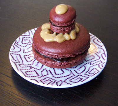Une recette gourmande : une religieuse de macarons au chocolat au lait, ganache de chocolat noir, petite déco de confiture de lait.
