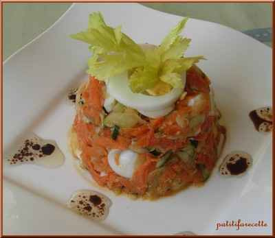 Laver tous les légumes. Râper les carottes ainsi que la courgette avec sa peau. Couper en petits morceaux le céleri branche. Y mélanger les gousses d'ail pilées, et le gingembre râpé ainsi que la pomme coupée en petits dés. Saler, poivrer. Assaisonner avec la vinaigrette faite d'huile d'oilve et de vinaigre basalmique. Ajputer les oeufs durs coupés en petites languettes; Remuer le tout . Remplir un ramequin avec la préparation , bien tasser et renverser sur une assiette. Servir bien frais.