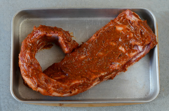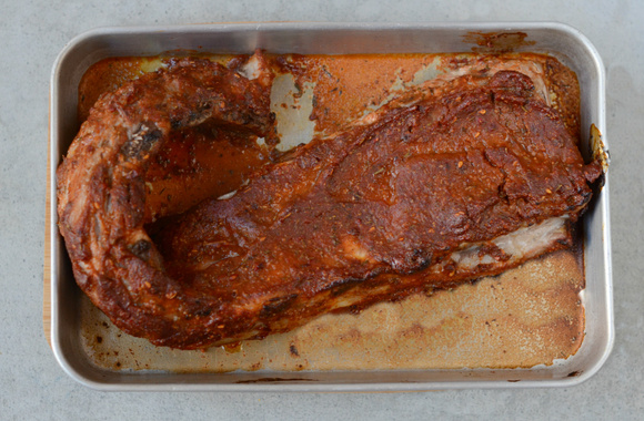 4Placez les travers de porc dans un plat à gratin creux et badigeonnez-les de marinade.