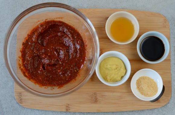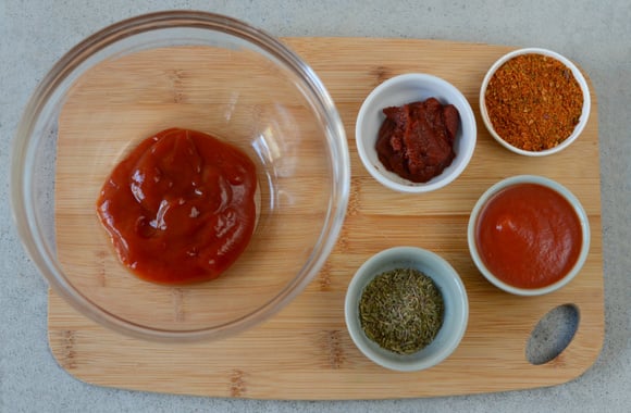 1Dans un bol, mettez le ketchup, le coulis et le concentré de tomate, les épices barbecue et le thym.