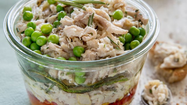 Dans un bocal, alterner les couches de légumes confits, petits pois et de rillettes. Pour le dressage, orner de quelques petits pois et d’une branche de romarin. Servez les rillettes avec des tranches de pain grillé.