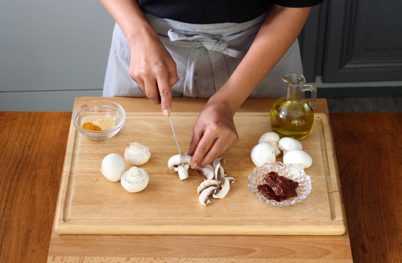 2Coupez les champignons en lamelles.
