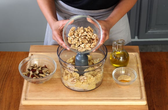 5Mettez les lentilles corail cuites dans un mixeur. Ajoutez les cerneaux torréfiés.