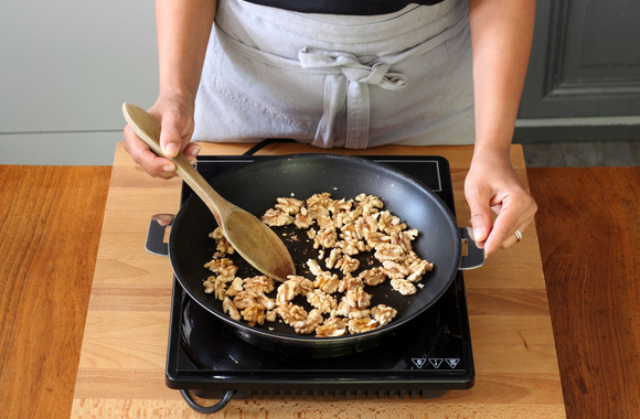 1Cassez les noix et récupérez les cerneaux. Torréfiez les cerneaux dans une poêle chaude en les faisant cuire 5 minutes. Ils sont prêts quand ils crépitent.