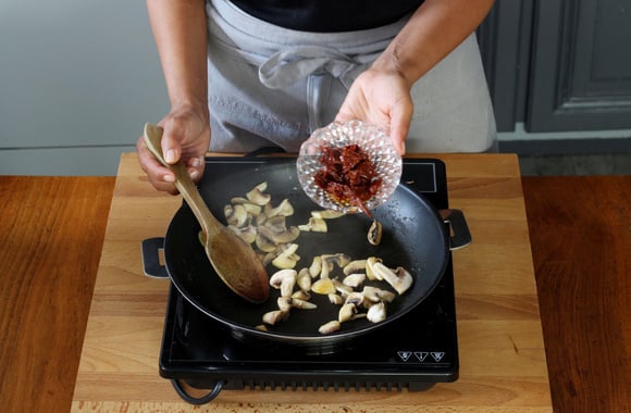4Dans une poêle, faites revenir les champignons avec l'huile d'olive puis ajoutez les tomates séchées et laissez cuire 5 minutes.